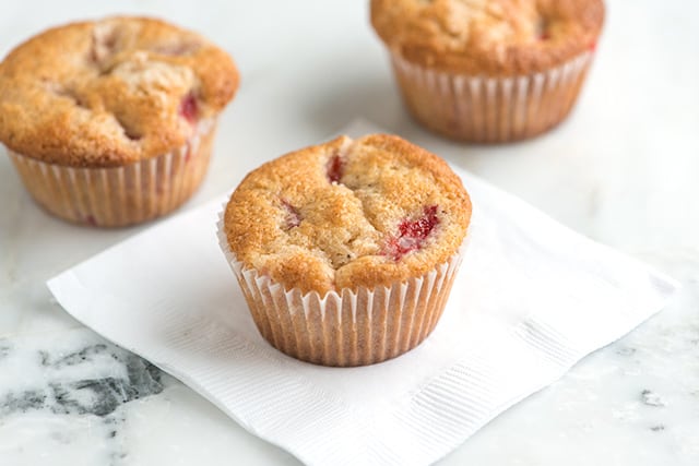 • 4/1 3 كوب طحين • 2/1 كوب سكر ابيض • 4/1 كوب زيت ذرة • 1 حبة بيض • 2 كوب فراولة مقطعة • 2 ملعقة صغيرة بيكنج باودرطريقة التحضير :