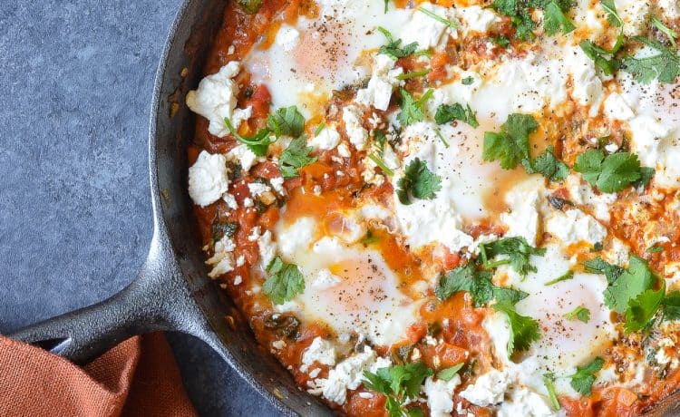 • 2 ملعقة كبيرة زيت زيتون<br /> • 2 حبة بصل صغير الحجم مقطع مكعبات <br /> • 3 فص ثوم مفروم<br /> • 1 حبة فلفل حلو مقطع مكعبات <br /> • ¾ ملعقة صغيرة بابريكا <br /> • 1 ملعقة صغيرة كمون<br /> • 1 ملعقة صغيرة كزبرة <br /> • ¼ ملعقة صغيرة رقائق الفلفل الأحمر المجفف<br /> • 2/1 1 ملعقة صغيرة من الملح<br /> • 1 ملعقة صغيرة سكر<br /> • 1 كيلو طماطم مقطعة مكعبات صغيرة <br /> • 2 كوب سبانخ مقطعة <br /> • ½ كوب كريمة طهى <br /> • 80 جرام جبن فيتا مفتتة <br /> • 6 حبات بيض <br /> • كزبرة مفرومة للتزيينطريقة التحضير :