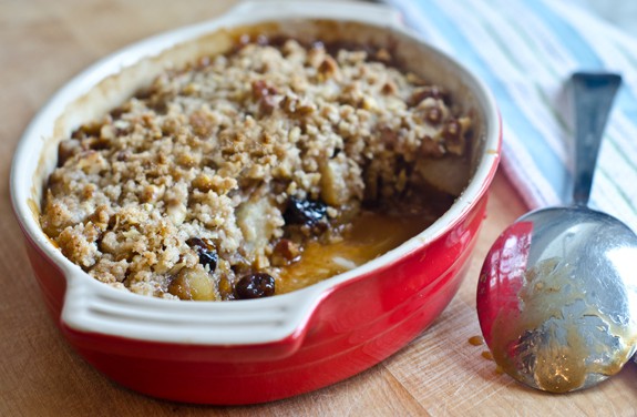 • مقادير طبقة الستريوسل :- <br /> • ½ كوب + 2 ملعقة كبيرة من الطحين <br /> • ¼ كوب + 2 ملعقة كبيرة من السكر<br /> • ½ ملعقة صغيرة جوزة الطيب <br /> • ½ ملعقة صغيرة قرفة <br /> • 1/8 ملعقة صغيرة ملح<br /> • 6 ملعقة كبيرة زبدة باردة مقطعة مكعبات <br /> • ¾ كوب جوز مفروم خشن<br /> • مقادير الحشوة :- <br /> • 3 ملعقة كبيرة سكر<br /> • 2 ملعقة كبيرة زبدة <br /> • 2 ملعقة كبيرة عصير برتقال <br /> • 1 ملعقة صغيرة بشر برتقال <br /> • ½ ملعقة صغيرة فانيليا <br /> • 1/8 ملعقة صغيرة ملح<br /> • ½ كوب كرز مجفف<br /> • 4 حبات كمثرى مقشرة ومقطعة مكعبات <br /> • كريم شانتيه أو آيس كريم الفانيليا للتقديم ( اختياري )طريقة التحضير :
