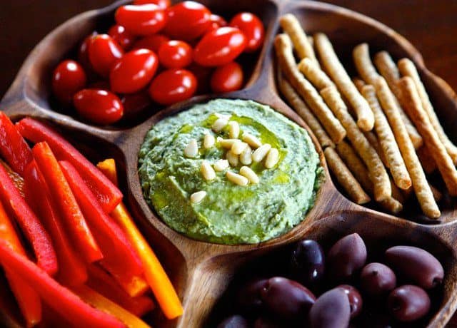 تناولي صلصة البيستو الصحية مع الطماطم والزيتون والخضار