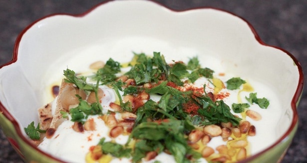 • 4 خبز صغير الحجم • 1 علبة حمص مصفاة • 2 كوب لبن زبادى • 2 ملعقة صغيرة طحينة • 2 فص ثوم • 1 عصير ليمونة • زيت زيتون • بقدونس مفروم للتزيين • بابريكا للتزيين • 2 ملعقة كبيرة صنوبر محمص للتزيين • 1/8 ملعقة صغيرة بيكنج صودا • ملح حسب الذوقطريقة التحضير :