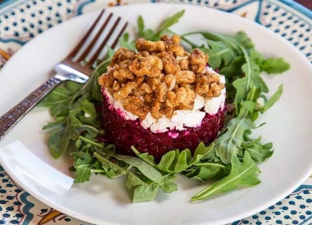 • 3 حبة بنجر (الشمندر) كبير الحجم، مشوي • 3 ملعقة كبيرة خل بلسمي • 2 ملعقة كبيرة زيت زيتون • ملح وفلفل • 2/1 كوب جوز مفروم • 4/1 كوب عسل أو شراب القيقب • رشة مسحوق الفلفل الحار • 2/1 2 كوب جرجير طازج • 4/1 1 كوب جبن الفيتا أو الماعزطريقة التحضير :