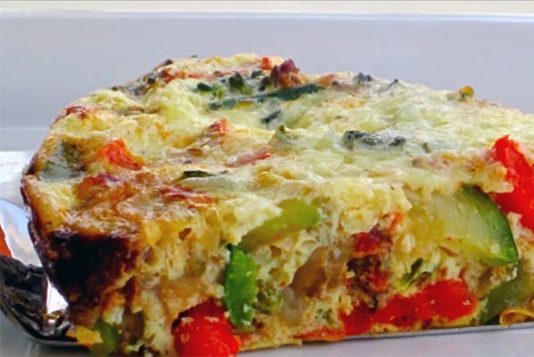 • 1/3 كوب بصل مفروم • ¼ كوب فلفل أحمر حلو مفروم • ½ كوب فطر مفروم • 2 فص ثوم مفروم • 1 ملعقة صغيرة ملح • 2 ملعقة كبيرة زبدة • 280 جرام سبانخ مجمدة ومذابة • 6 بياض بيض مخفوق • 3 كوب جبن أبيض مبشور