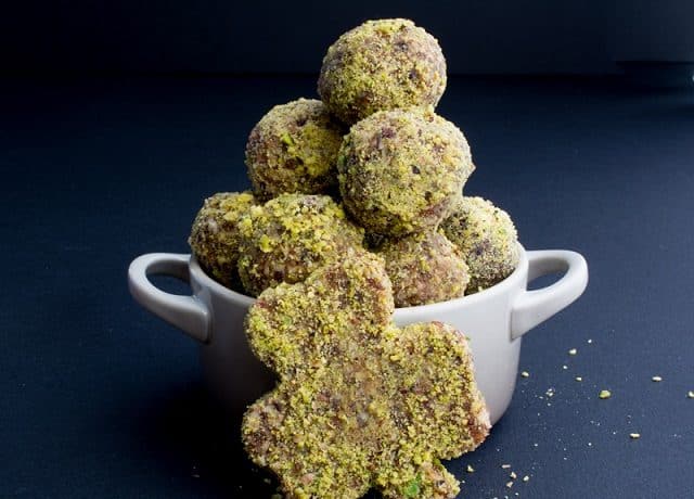 • 150 جرام ( 1 كوب ) من التمر • 60 جرام ( ½ كوب ) من اللوز الخام • 40 جرام ( ¼ كوب ) من الصنوبر الخام • 1 ملعقة كبيرة بذور الكتان مطحونة • 2 ملعقة كبيرة شوفان • 35 جرام ( ¼ كوب ) من الفستق الحلبى الخام المطحون خشن