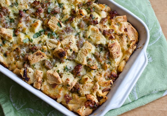 • 2 ملعقة كبيرة زبدة • ½ كيلو سجق • 1 حبة بصل مفرومة • 18 شريحة من توست بدون أطراف ومقطع مكعبات • 2/1 2 كوب من الجبن الشيدر المبشورة • ½ كوب بقدونس مفروم • 6 حبات بيض • 2 كوب كريمة • 1 ملعقة صغيرة ملح • ¼ ملعقة صغيرة فلفل أسود