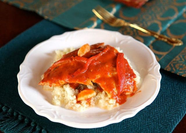 قدمي شرائح السمك بالصلصة والثوم مع كسكس القرنبيط.