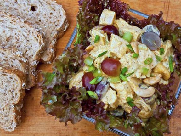 العنب والكاجو مع إضافة صلصة الكارى الدسمة كما أنه يفضل تقديم هذه السلطة على