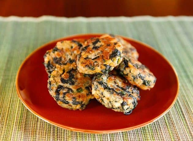 • 2/1 كوب + 1 ملعقة كبيرة زيت زيتون • 1 حبة بصل مفروم • 2/1 ملعقة صغيرة ثوم مفروم • 281 جرام سبانخ طازج، مغسول ومجفف • 1 حبة بيض • 1 كوب بطاطس مهروسة • 2/1 كوب فتات الخبز • 1 ملعقة صغيرة ملح • 4/1 ملعقة صغيرة مسحوق الفلفل الحارطريقة التحضير :