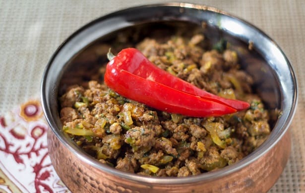 • ½ كيلو لحم بقرى مفروم • ¼ كوب بصل مفروم • ¼ كوب شرائح بصل • ¼ قطعة زنجبيل مفرومة • 4 فص ثوم مفروم • 1 فلفل أخضر حار مفروم • 1 فلفل أحمر حار • ½ ملعقة صغيرة مسحوق الفلفل الأحمر الحار • 2 ملعقة صغيرة زيت نباتى أو زيت الكانولا • ¾ ملعقة صغيرة ملح • 2/1 1 ملعقة صغيرة من مسحوق الكزبرة • 1 ملعقة صغيرة بذور الكمون • ¾ ملعقة صغيرة كركم • ¼ ملعقة صغيرة جرامامسالا • 1 ملعقة كبيرة معجون طماطم • 1 ملعقة كبيرة كزبرة مفرومة • ¼ : ½ كوب من الماءطريقة التحضير :