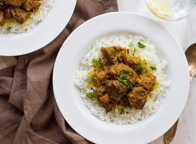 • 1 ملعقة كبيرة كركم • 2 ملعقة صغيرة فلفل أسود • 1 ملعقة صغيرة ملح • 1 ملعقة صغيرة مسحوق رقائق الفلفل الحار، اختياري • 3 ملعقة كبيرة زيت زيتون • 2 حبة بصل، متوسطة الحجم، مفروم • 1500 جرام لحم ضأن مقطع مكعبات • 3 ملعقة كبيرة معجون الطماطم • 4/1 كوب بقدونس أو كزبرة طازجة، مفروم • 4 كوب أرز بسمتي أبيض، للتقديم