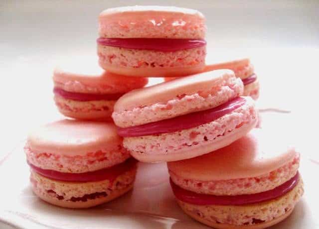 • 60 جرام بياض بيض • 30 جرام سكر ناعم • 50 جرام لوز مطحون • 90 جرام سكر بودرة • رشة ملح • 40 جرام مربى الفراولة • 1 : 2 قطرة من ألوان الطعام الأحمرطريقة التحضير :