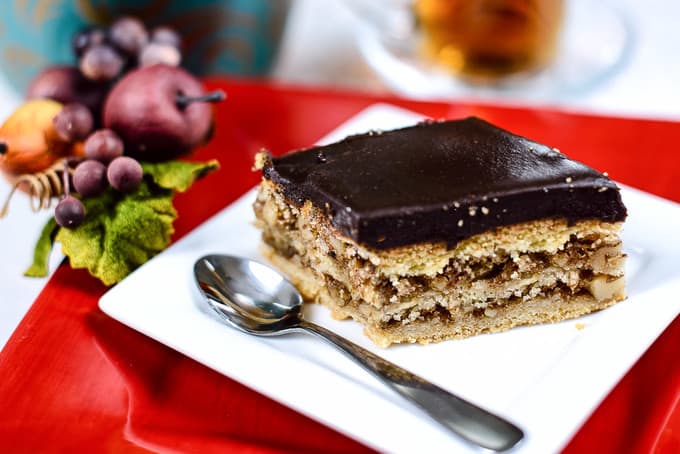 لعجينة الكيك : • 4 صفار بيض • 4/3 كوب سكر • 112 جرام زبدة مذابة • 1 كوب طحين • 1 ملعقة صغيرة بكينج بودر لحشوة المارينج بالبندق : • 4 بياض بيض • 4/3 كوب سكر • 400 جرام بندق مفروم لصوص الشوكولاتة : • 168 جرام شوكولاتة خام مفرومة • 4/3 كوب كريمة سائلة • 2 ملعقة صغيرة زبدة مذابةطريقة التحضير :
