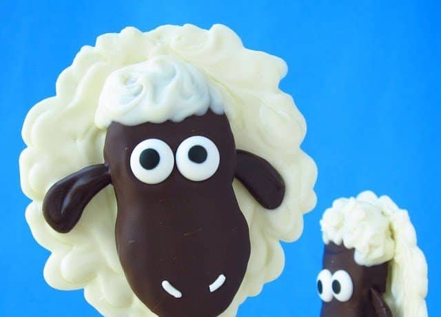 منتصف الدائرة وغطي سطحها بالشوكولاتة البيضاء، ثم ثبتي قطعة من بسكويت الخروف على