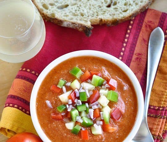 • 2/1 كيلو طماطم ناضجة • 2 شريحة خبز سمية • 1 حبة خيار متوسطة • ا حبة افوكادو • 1 كوب كرات مفروم • 2 فص ثوم مفروم • 2 ملعقة كبيرة خل • 4/1 كوب زيت زيتون • بصل • فلفل اخضر • عصير ليمون • كمون • بردقوش • فلفل حلو • ريحان • ملح • فلفلطريقة التحضير :
