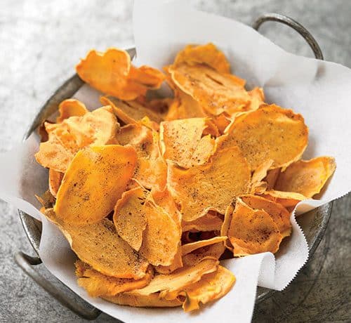 -ضعي رقائق البطاطا في صحن حراري وادخليه الميكروويف ويفضل فرد ورق الزبدة بقاع الصحن .
