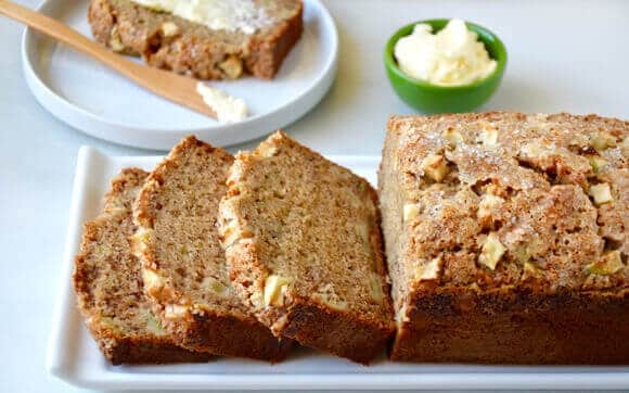 • 2 كوب طحين لجميع الأغراض • 1 ملعقة كبيرة طحين • 4/3 كوب سكر • 4/3 ملعقة صغيرة بكينج صودا • 1 ملعقة صغيرة قرفة مطحونة • 2/1 ملعقة صغيرة ملح • 3 حبات موز ناضجة جداً (حوالي 2/1 1 كوب موز مهروس) • 4/1 كوب رائب • 2 ملعقة صغيرة فانيليا سائلة • 6 ملعقة كبيرة زبدة مذابة • 2 حبة بيض، كبيرة الحجم • 4/1 1 كوب مكعبات التفاح (مقشر) • 2 ملعقة كبيرة سكر خشن، اختياريطريقة التحضير :