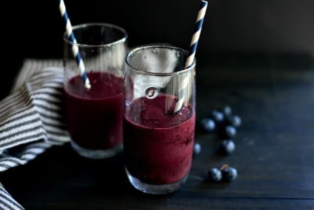 • 2/1 كوب عصير رمان • 1 كوب توت بنفسجي • 1 كوب توت بري • 10 حبات فراولة مجمدة • 2 حبة موز شرائح • 1 كوب زبادي • 1 كوب ثلج مجروش