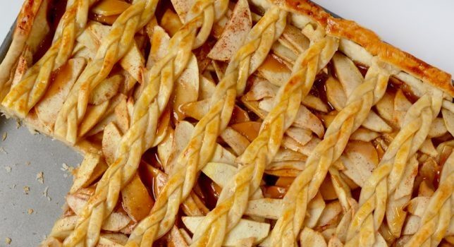 · امزجي التفاح والسكر والنشا والقرفة وعصير الليمون في وعاء كبير وقلبي. · افردي قطعة عجينة وقطعيها إلى أحبال طولية ثم قومي بتجديلها. · افردي عجينة التارت ثم ضعيها في صينية خبز مبطنة بورق الزبدة، زوعي التفاح على سطح التارت...