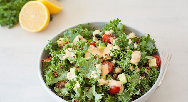 · المكونات المستخدمة. · في وعاء كبير، ضعي الكالي والكينوا. · أضيفي الكرفس والطماطم. · أضيفي الخيار. · حركي بشكل جيد. · في وعاء صغير، ضعي عصير الليمون والطحينة. · أضيفي زيت زيتون والملح. · حركي جيداً. · وزعي الصوص...
