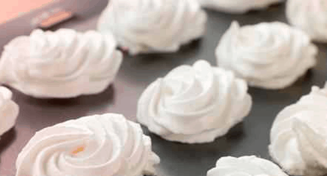1- يفصل بياض البيض عن الصفار ويوضع فى سلطانية جافة 2- يخفق بمضرب كهربائى حتى تتكون فقاعات كبيرة فيضاف كريم الطرطريك أو عصير الليمون حتى يتكون منقار لين 3- عند هذه المرحلة يستطيع بياض البيض حمل ذرات السكر فيضاف...