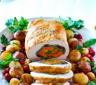 · انقعي صدر الديك الرومي في الماء والملح الخشن وقليل من الطحين والأعشاب المجففة . · اغسلي الأعشاب الطازجة وجففيهم تماماً ثم قومي بفرمهم فرماً ناعماً . · في وعاء كبير، اخفقي البيض والملح والفلفل، ثم أضيفي كوب الأعشاب المفرومة والتوت...