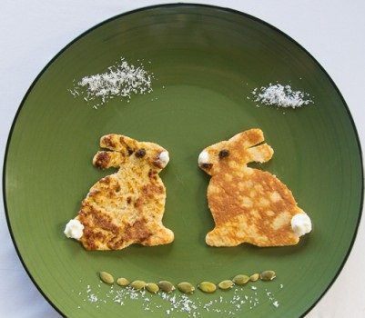 · قومى بتحضير البان كيك بالموزعن طريق إتباع الرابط . · استخدمى قطاعات الكوكيز المعدنية فى تقطيع البان كيك على شكل 2 أرنب بحيث يكونوا مقابل بعضهم البعض فى طبق التقديم . · ضعى حبة من الزبيب لكلا منهما لتحل...