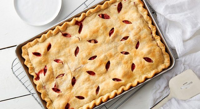 - قطعي العجينة إلى جزئين متساويين الحجم ثم افردي كل جزء بشكل مستطيل، افردي المستطيل الأول على قاعدة صينية خبز مدهونة بقليل من الزيت. - امزجي المقادير المتبقية في وعاء كبير.- وزعي الخليط السابق على سطح العجين ثم غطيه بقطعة العجين...