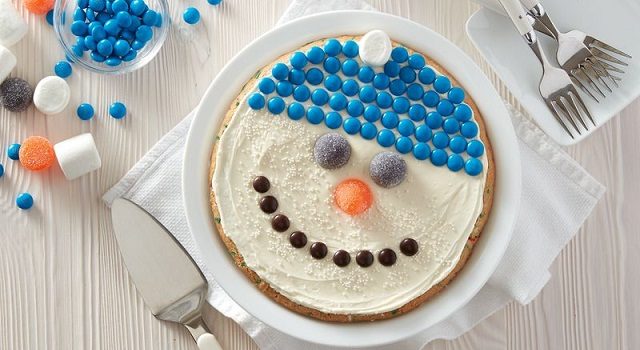 افردي عجينة التارت في صينية خبز دائرية واخبزيها ثم اخرجيها من الفرن واتركيها لتبرد. - زيني فطيرة الكوكيز بالكريمة وشوكولاتة إم آند إمز والحلوى الملونة لتشكيل وجه رجل الثلج. - قطعي التارت وقدميه في العام الجديد مع الهوت شوكليت....