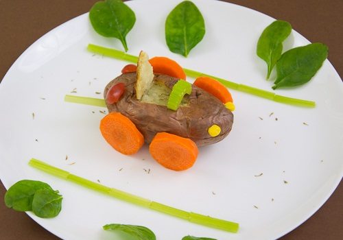 ·         اختارى حبة البطاطس ذات الشكل الاسطوانى ثم اشويها فى الفرن ( اتبعى الرابط لمعرفة الطريقة ) . ·         اقطعى مثلث صغير فوق سطح البطاطس واثنى الجلد لعمل الجزء الخلفى من مقعد السائق كما هو موضح بالصورة . ·         استخدمى...
