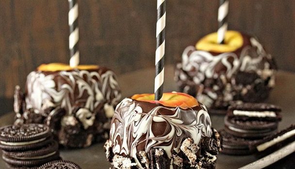 أوريو تفاح بالكارميل هو عبارة عن تفاح بالكراميل مغطى بشوكولاته بيضاء وداكنة رائعة ومحملة بقطع بسكويت الأوريو ( اختياري ) وهنا يمكنكِ إستخدام أى نوع من الشوكولاته البيضاء أو الداكنة مع قطع من بسكويت الأوريو بحيث يكون شكل التفاح مناسب...