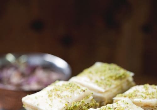 تحضير الشيرة او العسل : -ذوبي السكر مع الماء في مقلاة كبيرة واغلي المزيج ثم اتركيه علي نار هادئة وبعد اضيفي عصير الليمون واتركيه حتي يبرد .تحضير الحشو : -في وعاء الخلاط الكهربائي امزجي الفستق وماء الورد والحليب المكثف وشرائح التوست واخلطيهم...