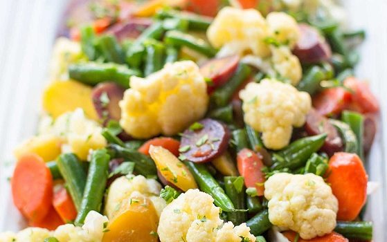 ·         ضعي الزيت في مقلاة طهي على نار متوسطة الحرارة. ·         أضيفي الخضار ثم رشي الملح على سطحها. ·         حركي الخضار لمدة 5 دقائق حتى تصبح ذهبية اللون قليلاً. ·         أضيفي الماء. ·         غطي المقلاة واتركيها لمدة 4 دقائق. ·        ...