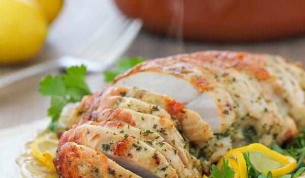 · المقادير المستخدمة. · تبلي صدر الديك الرومي بالملح والفلفل الأسود من جميع الجهات. · أذيبي 2/1 ملعقة كبيرة زبدة في مقلاة طهي غير لاصقة على نار متوسطة الحرارة ثم أضيفي الثوم المفروم وقلبي لبضع دقائق حتى يصبح لونه ذهبياً....