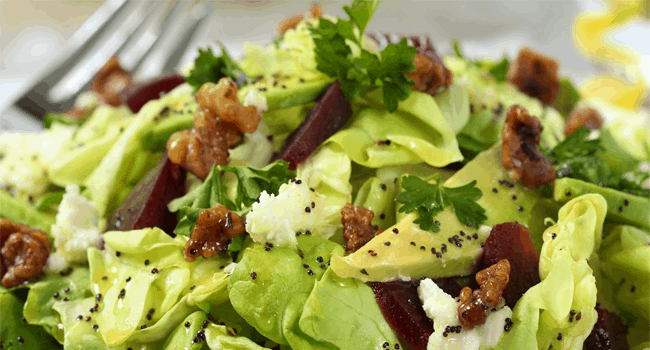 1. تغسل الخضار وتقطع . 2. يسلق الشمندر الاحمر ويقطع الى شرائح . 3. يقطع الافوكادو الى شرائح . 4. تقطع الطماطم الى شرائح ثم يفرم البصل . 5. تخلط مكونات السلطة وتحفظ فى الثلاجة فى طلق تقديم الى حين...