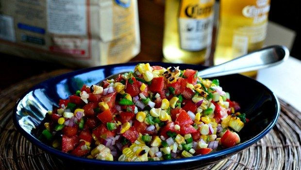 -اغسلي الطماطم وجففيها جيدا.-قطعي الطماطم إلي انصاف وافرغي القلب .-قطعي الطامطم إلي شرائح رفيعه .-في وعاء متوسط ضعي الطماطم بعد تقطيعها صغيرة .-قومي بفرط حبات الذرة مع الطماطم .-اضيفي البصل المفروم .-اضيفي البصل الاخضر المقطع .-اضيفي الكزبرة المفرومة مع الثوم...