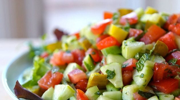 · في وعاء كبير، ضعي الخيار والطماطم والمخلل والنعناع المفروم. · في وعاء صغير، اخفقي زيت الزيتون وعصير الليمون والملح ثم صبي الصوص على السلطة وقلبي بشكل جيد. · ضعي السلطة في طبق التقديم (زيني الطبق بأوراق الجرجير أو الخس...