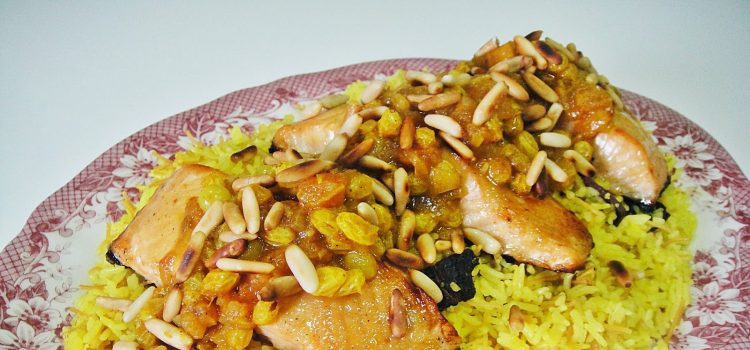 ·        قومى بتنظيف سمك السلمون وتقطيعه الى 4 شرائح . ·        لتحضير صلصة الزبيب ( صلصة السلطانة ) : فى مقلاة صغيرة سخنى الزيت ثم ضعى البصل وقلبيه حتى يصبح شفاف اللون حوالى 5 دقائق  ثم أضيفى الكركم والكارى والكزبرة...