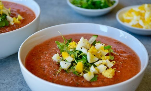 · قطعي الطماطم والفلفل الأحمر والفلفل الأخضر والخيار والبصل والثوم إلى قطع صغيرة. · ضعي جميع المكونات في وعاء معالج الطعام الكهربائي..اخفقي لمدة 2 دقيقة، أضيفي الملح والفلفل حسب الذوق..ضعي الحساء في طبق التقديم وزينيه بالبيض المسلوق ومكعبات الأفوكادو. ·...