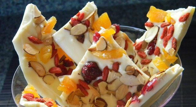 · أذيبي الشوكولاتة البيضاء. · افرديها في صينية خبز مبطنة بورق الزبدة ثم وزعي الفواكه المجففة والمكسرات على سطح الشوكولاتة. · ضعي الصينية في الفريزر لمدة 30 دقيقة ثم قطعيها إلى مربعات وقدميها مع القهوة. · صحتين وهنا. · المصدر:...