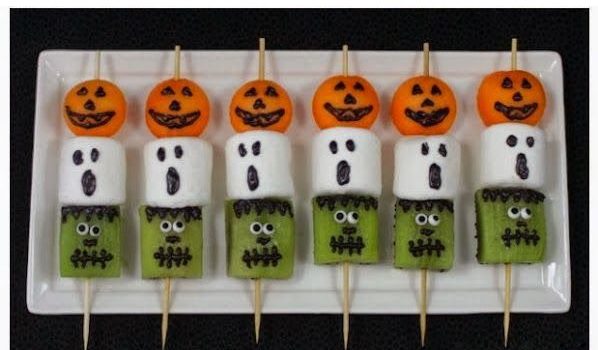 ·         المكونات المستخدمة. ·         اغرسي حبة من الكيوي ثم المارشميلو ثم المشمش في سيخ خشبي. ·         ضعي الشوكولاتة المذابة في أنبوب تلوين الحلويات ثم قومي برسم ملامح الهالووين على سطح الفواكه والمارشميلو، كما هو موضح بالصورة. ·         اتركي الشوكولاتة لتجف...