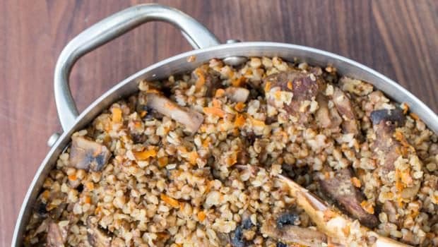 ·         المكونات المستخدمة، الحنطة السوداء هي احدى النباتات المفيدة جداً للجسم ومذاقها يشبه الكينوا والكسكسي، قومي بطهيها على نار متوسطة الحرارة مع 2 كوب ماء مغلي حتى تنضج. ·         قطعي اللحم إلى مكعبات (1 بوصة). ·         سخني قليل من الزيت...