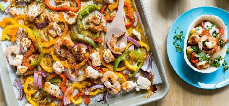 ·         وزعي الدجاج والروبيان والفلفل والبصل في صينية خبز مبطنة بورق الزبدة ثم رشي توابل التاكو. ·         أضيفي زيت الزيتون وقلبي. ·         ضعي الصينية في فرن محمي على حرارة 400 درجة فهرنهايت لمدة 15 – 18 دقيقة أو حتى ينضج...