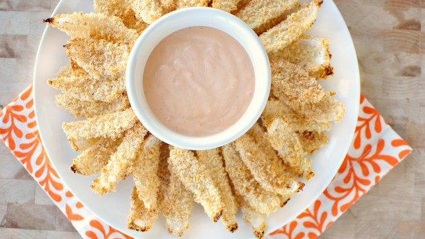 -سخني الفرن لدرجة 400 درجة مئوية .-قومي بتقطيع البصل ارباع كما هو موضح بالصورة .-افرغي شرائح البصل .-في وعاء متوسط ضعي الطحين وووعاء اخر ضعي البقسماط وقومي بتقسيم التوابل بينهم واخلطي .-في وعاء اخر قومي بخفق بياض البيض .-قومي بتغطية...