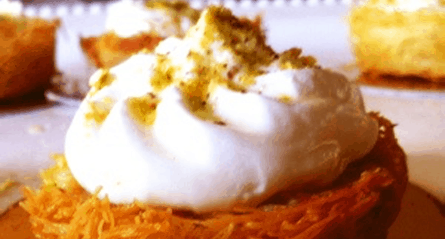 1. يوضع شعر الكنافة على الطاولة ويلف حول المحيط الخارجى للكوب وحول اسفلة .2. يستخرج الكوب الصغير من قالب الكنافة وتكرر العملية نفسها حتى الحصول على عدة قوالب . 3. يحمّى الفرن مسبقا , وتدخل أكواب الكنافة لمدة 8 –...