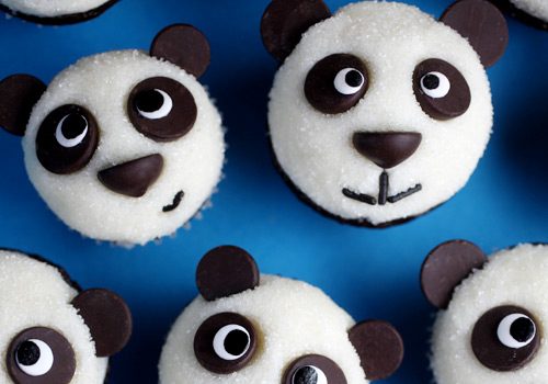 - احضري كعكات كب كيك الشوكولاتة بعد تبريدها . - احضري رقائق الشوكولاتة لتزيين وجه الباندا .- قومي بتحضير الكريمة البيضاء لتزيين وجه الكب كيك .- احضري قمع الكريمة المثلجة وغطي وجه الكب كيك . - اغمسي وجه الكب كيك في السكر...