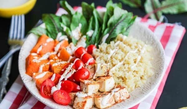 · تعتبر هذه الوجبة من الوجبات الصحية المتكاملة العناصر الغذائية عهى تحتوى على الخضروات الطازجة والمشوية والبروتينات من التوفو ويمكن أيضاً إضافة الحمص للمزيد من البروتينات ، والحبوب من الكينوا ويمكن إستبدالها بالأرز البنى ، مغطاة بخلطة صحية وهى دريسنج...