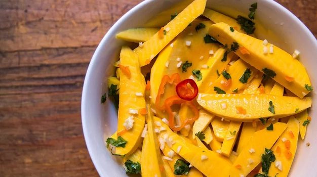 · المكونات المستخدمة. · في وعاء كبير، ضعي الملح وشرائح الفلفل وشرائح الثوم والبصل، افركي المقادير مع الملح لتعزيز النكهة. · اغسلي المانجو ثم قشريها وقطعيها إلى أصابع طولية. · أضيفي المانجو إلى الثوم والفلفل ثم أضيفي الكزبرة المفرومة والليمون....