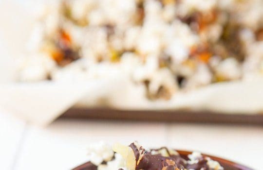 -افردي الفستق المحمص حتي تقومين بطحنه طحن خشن .-في مقلاة علي نار خفيفه ضعي الفستق والفواكه المجففه لتمتزج .-قومي بفرط الفشار علي ورق الزبدة ورشي قليل من الملح . -قومي بإذابة الشوكولاتة الداكنه اكثر من مره حتي تصبح سائلة تماما وقابله...