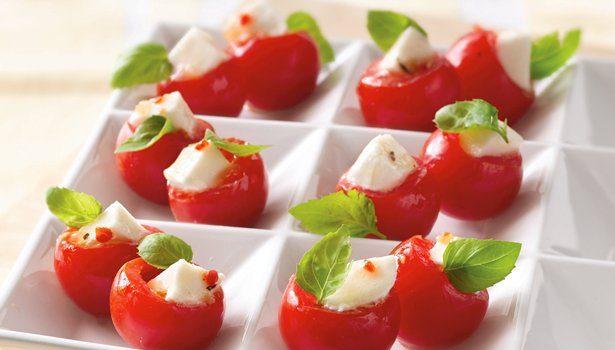 1- قومى بقطع الجزء الأعلى من الطماطم 2- قوريها وإنزعى البذور من الداخل 3- ضعى مربع الجبن الموتزوريلا داخل كل خبة طماطم 4- ضعيها بالفرن لمدة 5 دقائق 5- زينيها بأوراق الريحان الطازجة...