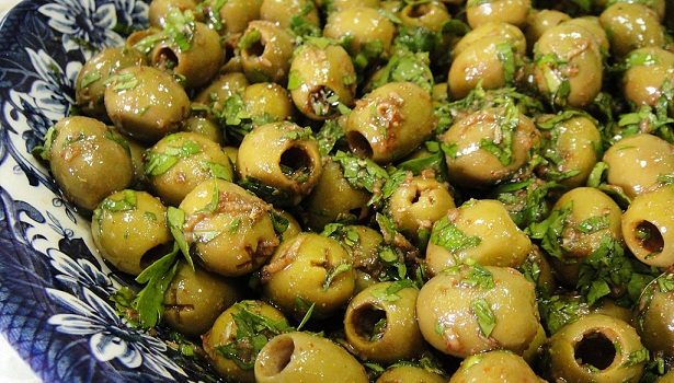 ·        استخدمى الزيتون الأخضر المخلل بدون نواة مع عمل شق فى أسفله على شكل  x كما هو موضح بالصورة . ·        ضعى فى وعاء كبير كلا من ( الزعتر – البقدونس – الثوم – الكزبرة – الفلفل الاحمر ) وقلبيهم...